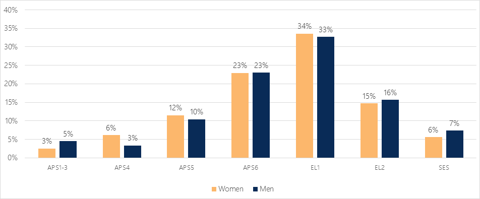 Given the gender pay gap at the classification levels is relatively low, the smaller proportion of females at the higher classifications is the main driver behind the 3.3% organisational pay gap (see Figure 2 and Table 2). The larger proportion of women at lower classifications makes the average female salary lower. A lower average female salary results in a gender pay gap.