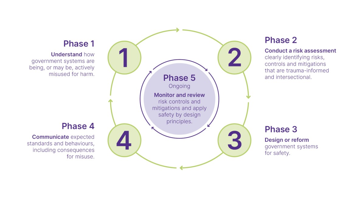 The phased approach below can be applied to systems broadly to prevent abuse, drive perpetrator accountability and change behaviours. Government systems vary widely in their design and operation. Agencies may need to adapt the approach to embed safety by design across different systems. This guidance is not prescriptive. It can and should be adapted to each agency’s particular context.