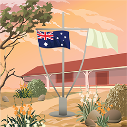 When the Australian National Flag is being displayed from a flagpole fitted with a yardarm and is flying with another national flag, the Australian National Flag should be flown on the left of the yardarm and the flag of the other nation should be flown on the right of the yardarm, as viewed from the front of the flagpole/gaff combination.