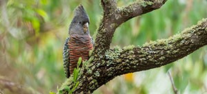 Gang-gang cockatoos are showy dark grey birds with feathers edged with lighter grey or white. The males have strikingly coloured red heads capped with tousled longer feathers.