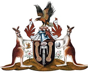 The Coat of Arms is symbolic of the people, history and landscape of the Northern Territory. It features the floral and fauna emblems, the Sturt’s desert rose, 2 red kangaroos and a wedge‑tailed eagle.